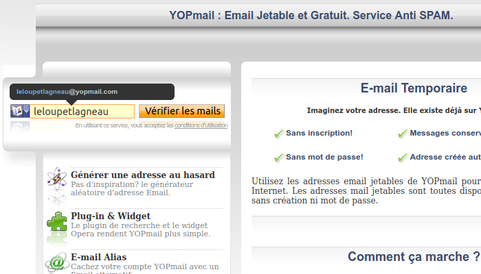 Yopmail est un service gratuit qui permet d'envoyer et de recevoir des messages sans être client de messagerie et sans avoir d'adresse personnelle. Il suffit d'un accès à internet dans n'importe quel cybercafé du monde.