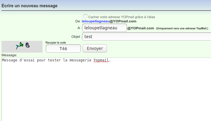 5 - Je renseigne l'adresse : "leloupetlagneau", puis l'objet : "test", je recopie le code et j'écris mon message. Je clique sur "Envoyer".