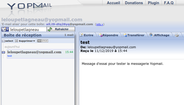 6 - Je reviens sur la page d'accueil pour vérifier mes mails. Mon mail apparaît. Je peux alors écrire, répondre ou transferer.